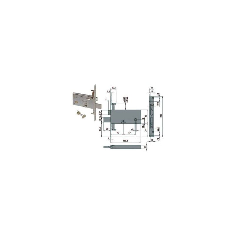 Mm.70 (57318730) quadro maniglia, 4 mandate, con catenaccio, scatola e frontale in acciaio con rivestimento in zinco, catenaccio in acciaio nichelato, con quadro maniglia da mm.8 passante, piastra di protezione antiscasso, predisposizione per chiusure supplementari, dotazione borchia interna in acciaio, coppia di boccole filettate e 2 chiavi, aste non comprese, scatola mm.82h. Pezzi per confezione primaria: 12,0 Larghezza 31,8 Lunghezza 20,2 Altezza 20,5 Peso 13,225