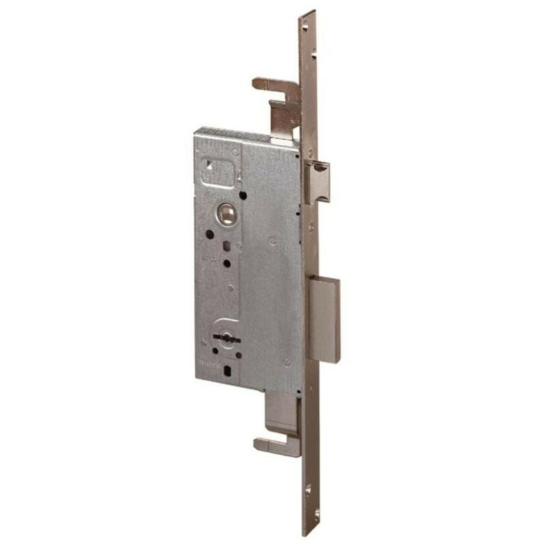 Serratura triplice da infilare a portoncino con doppia mappa a 2 mandate, catenaccio e scrocco, fornito con 3 chiavi lunghe, predisposizione per chiusure supplementari, contropiastra e due piastrini guida prolunghe in dotazione Interasse: 85 Frontale: 25 CARATTERISTICHE Frontale e contropiastra in acciaio nichelato Scatola in acciaio con rivestimento in zinco Scrocco reversibile piatto ad invito, nichelato Catenaccio in acciaio nichelato Rullo regolabile dai 2 ai 13 mm.
