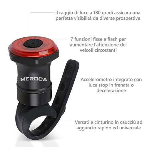 Luce posteriore con funzionalità "Stop" ad ogni frenata o decelerazione. 7 diverse modalità di illuminazione fisse e lampeggianti visibili anche su lunghe distanze. Ampia superficie di illuminazione sulla lampada.