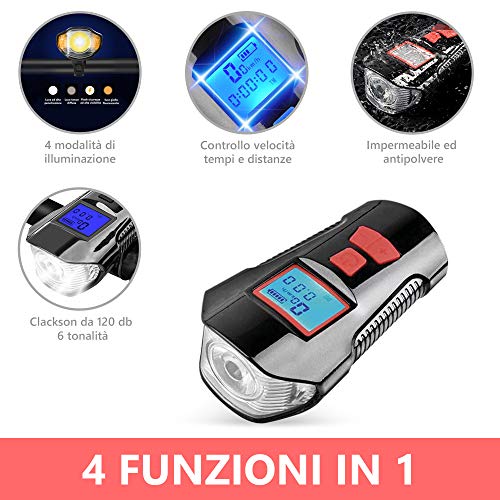 Kit luce anteriore e posteriore con funzionalità clacson e computer di bordo. Ricaricabile con porte USB. telecomando incluso.
