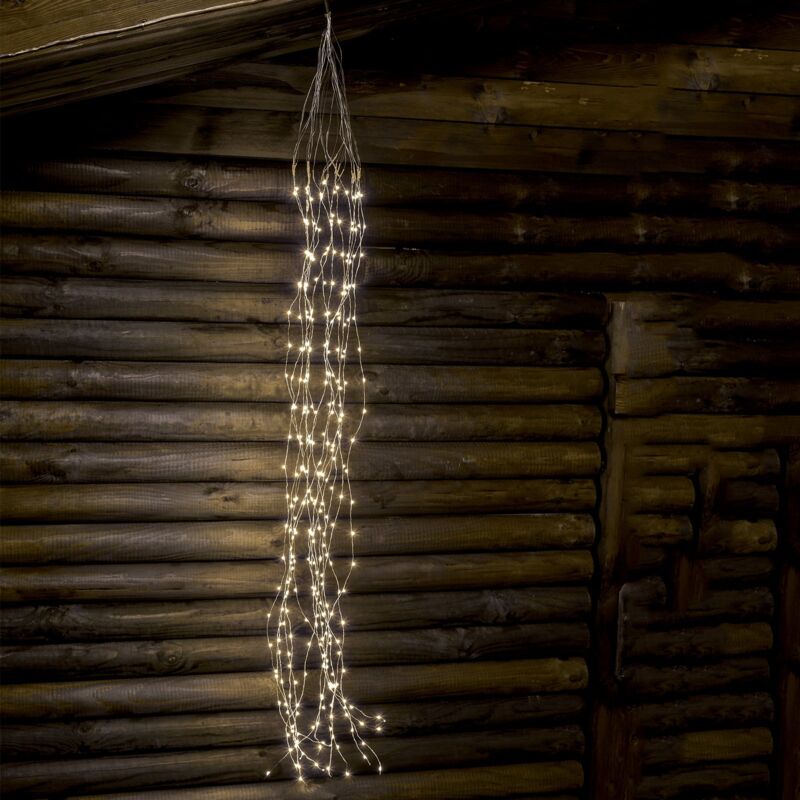 Questo fascio in metallo ha dei micro led distribuiti su diversi fili metallici argentati. Il riflesso di luce irradiato da questi piccolissimi bulbi led a forma di goccia sull'argento dei fasci produce un magnifico effetto luminoso. Tra i vantaggi che offre questa catena c'è inoltre il cavo sottile e duttile che si mimetizza tra le decorazioni e può essere plasmato in ogni forma. La cascata di luci è pensata per decorazioni interne di pareti, davanzali interni, scaffali. Ideale a Natale ma anche per allestire luoghi chiusi in modo scenografico in occasione di matrimoni o feste estive. ALIMENTAZIONE Cavo di alimentazione: Incluso Alimentazione: 4,5 Volt Trasformatore: Incluso DIMENSIONI Lunghezza: 260 cm Lunghezza cavo di alimentazione: 4 m TIPO LUCE Colore luce: Bianco Caldo Sorgente luminosa: Led Tipo led: Microled Ø 1,5 mm Effetto luminoso: Luce fissa Numero lampade: 1220 Numero calate: 40 GENERALE Colore cavo: Argento Potenza: 6 Watt Tipo cavo: Metallo Uso: Interno / Esterno