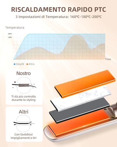 【Ceramica Piastra per Capelli USB Senza Fili】La tecnologia in ceramica a ioni negativi aiuta a trattenere più umidità, riducendo i danni ai capelli, prevenendo l'effetto elettrostatico e donando ai tuoi capelli un aspetto sano e luminoso. La piastra per capelli CkeyiN offre una soluzione completa per ogni tipo di capello, permettendo di ottenere onde, capelli lisci, acconciature con fibbia interna o frangia.