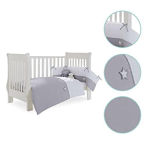 Questo bellissimo set per lettino/culla dotata di morbido cotone Per tessuti combinato con morbido jersey di cotone, rifinita con una delicata grigio argento trim e un cotone rivestito Star.