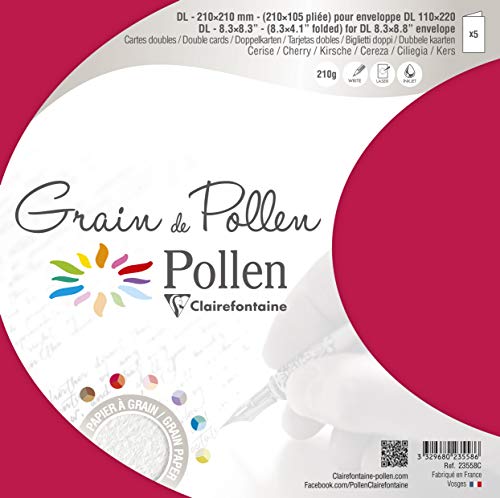 Clairefontaine 23558C - Pacco da 5 Biglietti Doppi- Formato 10,5x21cm - 210g/m² - Colore Ciliegia - Biglietto d'invito Eventi e Corrispondenza - Gamma grana di Pollen- Carta Premium a grana