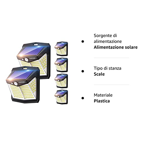 【Pannelli Solari ad Alta Efficienza】Claoner luce solare led esterno ha un angolo di illuminazione di 270 °, che è più larga altre luci led solari e fornisce una gamma più ampia di illuminazione. La nostra batteria ricaricabile agli ioni di litio può fornire tempi di illuminazione più lunghi rispetto ad altri prodotti simili.