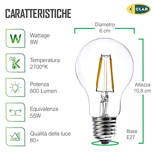 CLAR - Lampadine Vintage E27 Luce Calda, Lampadina Vintage E27 Luce Calda, Lampadine Vintage, Lampadina Vintage, Lampadine LED E27 Luce Calda, Lampadina LED E27 Luce Calda, 8W E27 2700K (Pack 10)