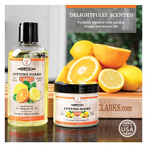 CLARK'S Olio e Cera per Taglieri (Set di 2 Bottiglie) | Include Olio per Taglieri CLARK'S (12oz) e Cera di Finitura CLARK'S (6oz) | Profumazione Arancia e Limone