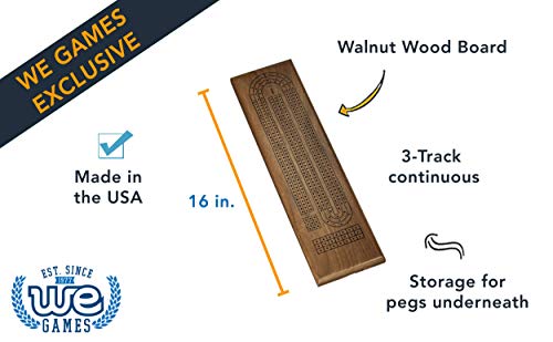 Classic Cribbage Set - Solid Walnut Wood Continuous 3 Track Board with Metal Pegs by WE Games