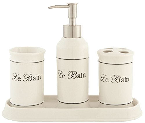 Clayre & Eef 62474 - 4 pezzi. Set da bagno in ceramica color bianco crema “Le Bain”, bicchieri, dispenser di sapone e vassoio