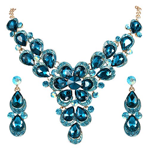 Clearine Gioielli Set Matrimonio Sposa Cristallo Forma a Goccia Fiore di Petalo Statement Orecchini Pendenti con Collana Set Blu Colore Topazio Oro-Fondo