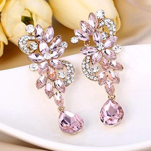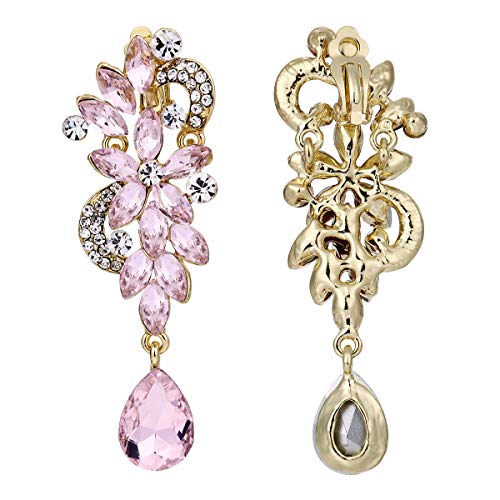 Clearine Orecchini a clip Boemo Boho Cristallo Fiore Sposa di nozze lacrima luminoso Lungo Mazzo di Fiore Clip-On Orecchini a clip Pendenti Rosa Chiaro Oro-fondo