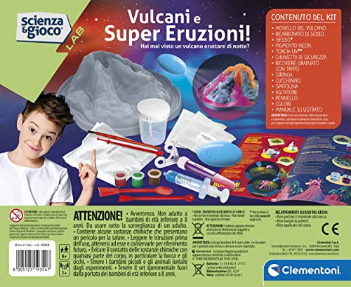 Clementoni - 19354 - Scienza E Gioco Lab - Vulcani E Super Eruzioni - Esperimenti Scientifici Per Bambini Dagli 8 Anni, Eruzione Vulcanica Didattica Fluorescente (Gioco In Italiano), Made In Italy