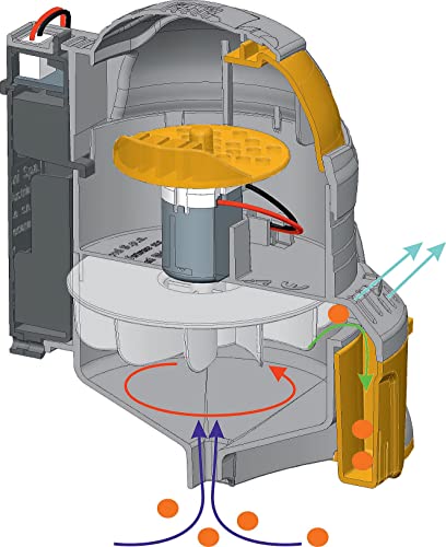 Dotato di un motore elettrico a doppio asse, al quale sono collegati un eccentrico e una ventola, il robottino è in grado di vibrare e aspirare detriti leggeri, come ad esempio polvere e briciole.