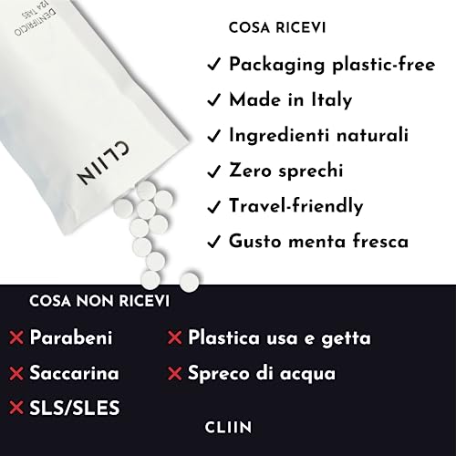 CLIIN Dentifricio Solido NO FLUORO Made In Italy| 124 compresse (2 mesi per 1 persona) | Vegano e Plastic free | Ecosostenibile e Perfetto per i Viaggi | Dentifricio Naturale Sbiancante