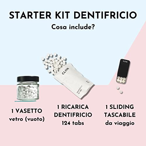 CLIIN Starter Kit Dentifricio Solido Idrossiapatite NO FLUORO | Made in Italy 124 compresse (2 mesi per 1 persona) | Dentifricio Ecosostenibile e Perfetto per i Viaggi | Dentifricio Sbiancant Naturale