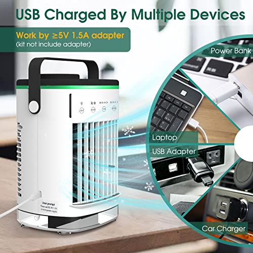 【Raffreddatore d'aria personale 4 in 1】 Il nostro mini condizionatore d'aria desktop multifunzionale con 4 funzioni tra cui ventola di raffreddamento, purificatore, umidificatore, luce d'atmosfera a LED a 7 colori. È alimentato da USB, affinché il raffreddatore ad aria funzioni bene, SI PREGA di utilizzare un adattatore da 5,0 V-1,5 A