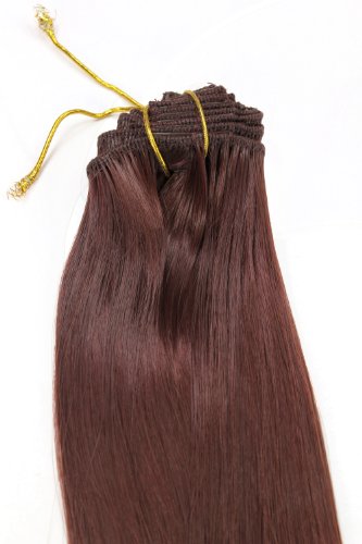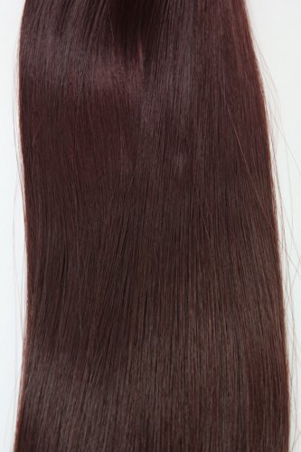 Set 8 parti, intera testa mogano scuro, extensions con graffette(clip) per fissaggio. Il set completo consta di: 4 Extension ognuna con 1 clip e una larghezza di 3,5 cm, 2 Extension ognuna con 3 clip e una largezza di 15 cm, 1 Extension con 3 clip e una larghezza di 18 cm, 1 Extension con 3 Clip e una larghezza di 23 cm. Le ciocche hanno una lunghezza di 40 cm, pesano in totale nel set circa 130 gr.