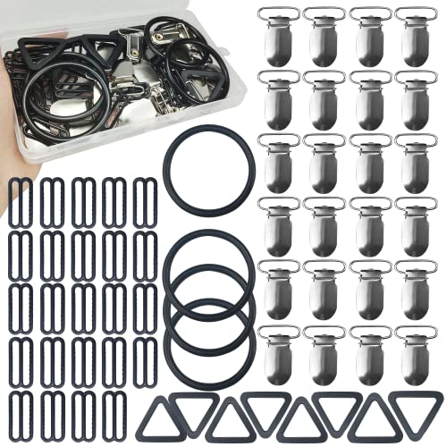 Clip per lenzuolo, chiusura regolabile per lenzuolo, set di clip per pinze, 24 fibbie per becco d'anatra da 2,5 cm, 24 fibbie nere da 2,5 cm, 8 fibbie triangolari, 4 anelli in plastica nera da 5 cm