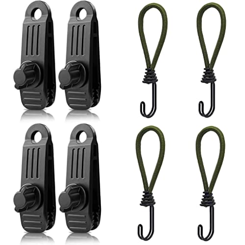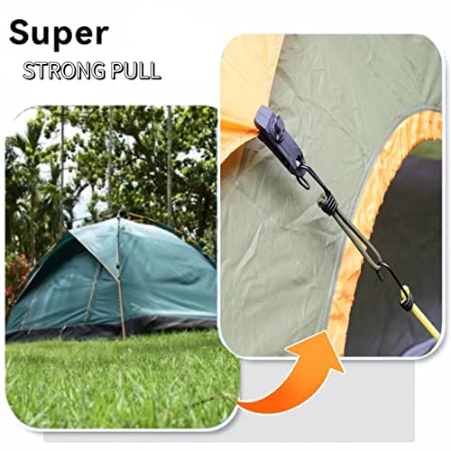 Combinazione multifunzionale: 4 clip per tenda + 4 corde elastiche è una potente combinazione in grado di resistere a una forte forza di trazione e può essere ampiamente utilizzata in tende, tende da sole, roulotte, teloni, teloni, ecc. Sono ideali per il campeggio all'aperto, la vela o un must -fai un picnic.