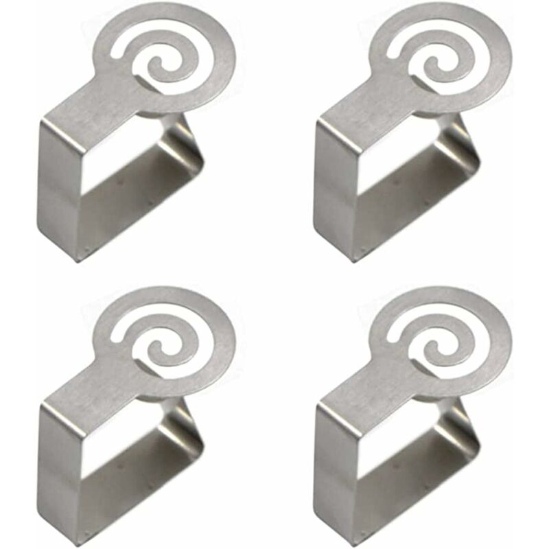 4 Morsetti da tavolo: questi morsetti per tovaglie sono realizzati in acciaio inossidabile ad alta elasticità e sono resistenti alla corrosione. L'esposizione a sostanze chimiche nocive, sale, grasso e umidità o temperature elevate possono causare ruggine. Si prega di pulire immediatamente la tovaglia, fissarla o asciugarla con un panno morbido. Design con motivo a spirale: questa clip per tovaglia adotta un delizioso motivo a spirale, che può fornire sia decorazioni di alta qualità che raffinate. La clip per tovaglia è argento discreto, che si fonde armoniosamente con l'aspetto decorativo generale della stanza corrispondente. Design antivento: il supporto per tovaglia in acciaio inossidabile lo tiene sempre in posizione, anche in caso di raffica di vento, lo non scivolerà, non galleggerà né scivolerà. Facile da usare: adatto a tavoli con uno spessore massimo di 3 cm, facile da installare, non c'è bisogno di perdere tempo a riporre le tovaglie, è molto comodo e può risparmiare il tuo