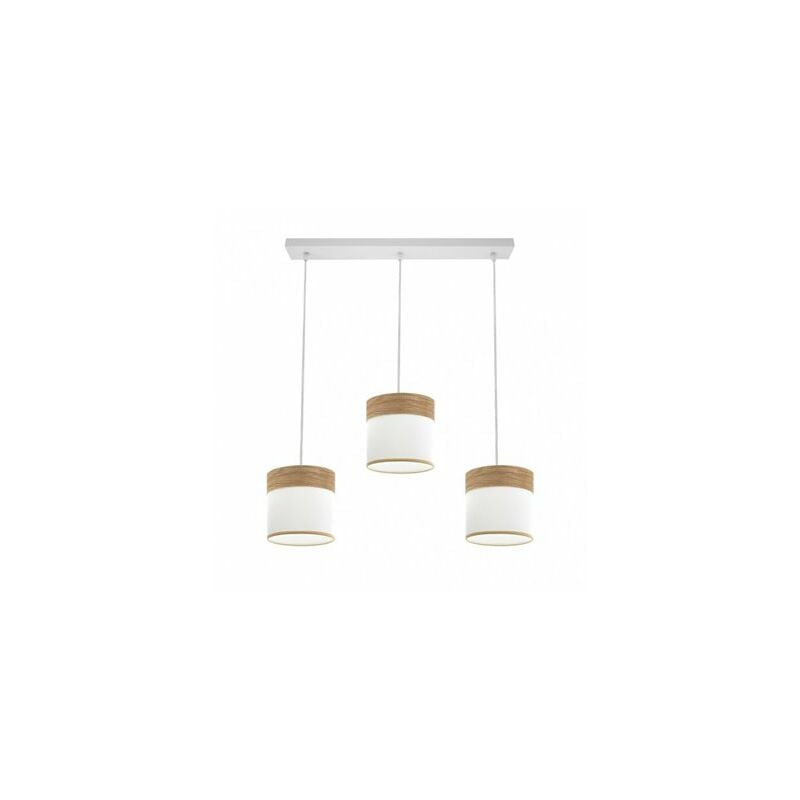 Striscia di design della serie CLOE di colore BIANCO con schermo BIANCO/LEGNO CHIARO. Realizzato in metallo e tessuto. Con uno stile moderno, presenta un contrasto di colori sui suoi paralumi, risultando in un'illuminazione molto originale e decorativa in camere da letto, sale da pranzo, soggiorni e aree di lavoro, creando un'atmosfera diversa. Ha tre portalampada E27. Lampadine non incluse. I suoi schermi possono essere posizionati a diverse altezze, avendo dimensioni di 35