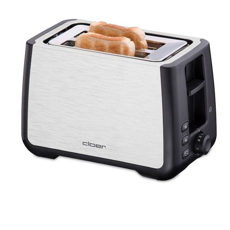 Tostapane Cloer 3569 King Size Per 2 fette di pane tostato XXL, dimensione massima: 12 x 12 cm Spegnimento di sicurezza se il pane si incastra nel vassoio raccoglibriciole Accessorio per il pane integrato Alloggiamento in acciaio inossidabile con elementi in plastica nera, isolato termicamente Dimensioni: 29,5 x 16,5 x 19,5 cm Potenza: 850-1000 Watt Materiale/colore: acciaio inossidabile/nero