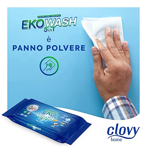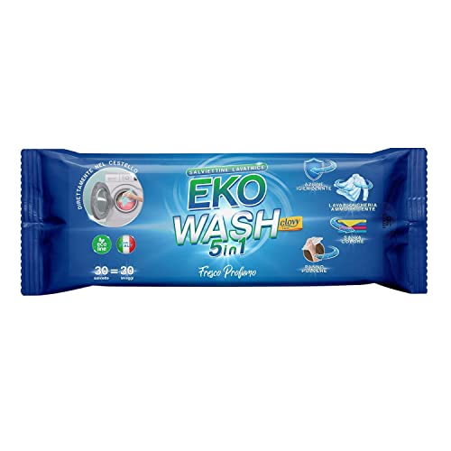 CLOVY Eko Wash è un panno con 5 funzioni impregnato con un prodotto LAVABIANCHERIA, IGIENIZZANTE ed AMMORBIDENTE. Il detergente è adatto ad ogni tipo di tessuto: rimuove lo sporco e consente una profonda igienizzazione. L'ammorbidente distende le fibre dei capi. Dona elasticità, morbidezza ed un gradevole profumo, facilitando la stiratura. La presenza del panno, garantisce l'azione salvacolore eliminando la lanuggine. A fine lavaggio la salvietta sarà utilizzata per lo spolvero.
