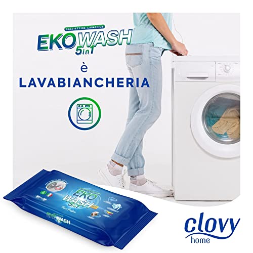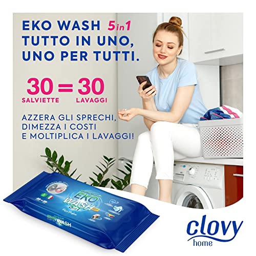 CLOVY Eko Wash 5in1 60 SALVIETTE imbevute per BUCATO a 5 AZIONI: LAVABIANCHERIA - AMMORBIDENTE - IGIENIZZANTE - SALVACOLORE - PANNO CATTURAPOLVERE. Direttamente nel cestello! (2)