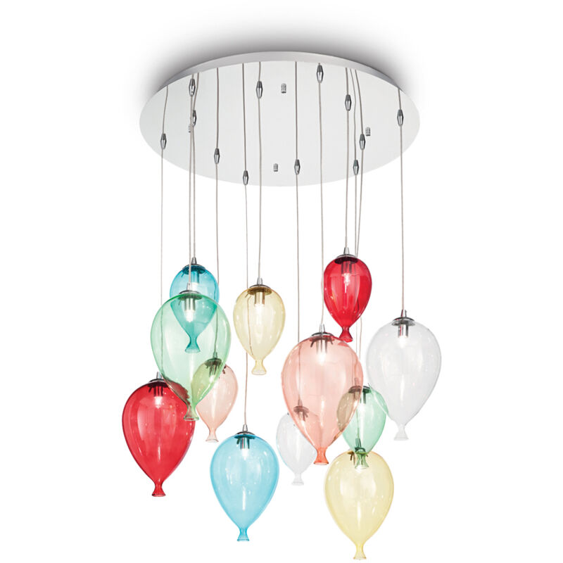 Montatura in metallo cromato con diffusori in vetro soffiato multicolor modellato a mano Ø 60 x H min 49 / max 100 cm G9 max 12 x 28W IP:20