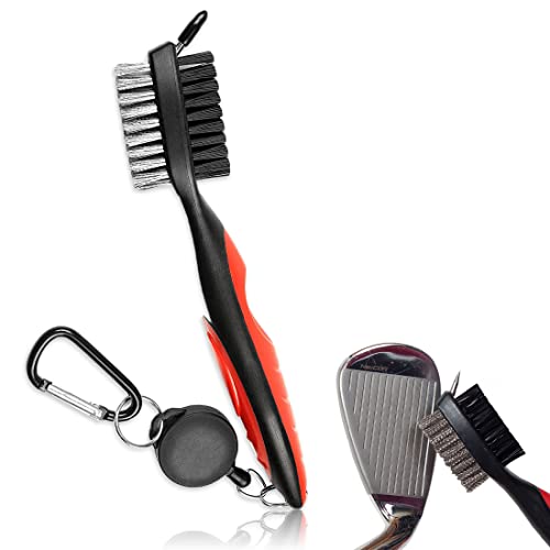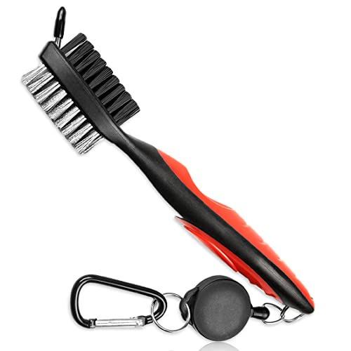 DESIGN UNICO - Questa spazzola per mazze da golf è progettata con doppie testine per una pulizia rapida ed efficace delle grondaie in ferro delle mazze da golf. Spazzola di pulizia in nylon su un lato per rimuovere sporco ed erba dalle racchette in ferro. L'altro lato ha spazzole metalliche per racchette di legno. Soprattutto in caso di pioggia o inverno, la spazzola per mazze da golf sembra essere un accessorio da golf più importante