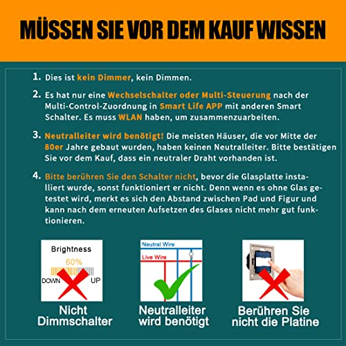 Installazione semplice: piastra da parete senza viti in formato standard UE. Il manuale ti guida attraverso il processo di cablaggio e imposta l'app. Nessun hub richiesto, solo per Wi-Fi 2.4G (non 5G). È necessario un conduttore neutro. Approvato RoHS e CE. Alimentazione: 1000 W/passaggio, AC 90-250 V.