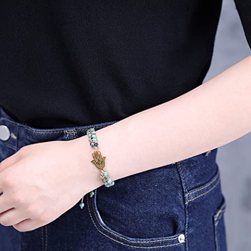 COAI Bracciale Regolabile Intrecciato a Mano con Doppio Strato di Perle in Turchese Africano e Amuleto Mano di Fatima