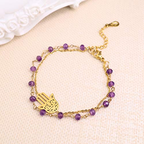 COAI Bracciale Romantico da Donna e Ragazza Doppio Strato con Perline in Ametista e Mano di Fatima, Bracciale Regolabile in Rame Placcato Oro