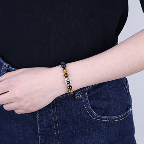 Materiale e Taglia: onice opaca 8mm, occhio di tigre, mano hamsa in lega con inserto perla onice 4mm, adatto a polsi di 14-16cm