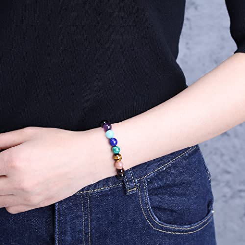 Materiale e Taglia: tormalina 8mm, pietre 7 chakra (ametista, amazzonite, lapislazzuli, malachite, occhio di tigre marrone, pietra del sole, occhio di tigre rosso), adatto a polsi 14-16cm