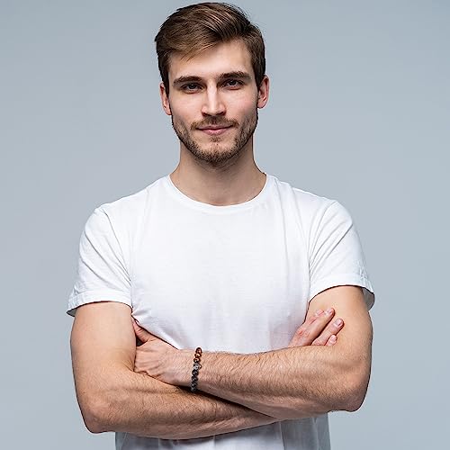 COAI Bracciale da Uomo Regolabile con Perle in Onice Opaco e Occhio di Tigre Marrone Annodate a Mano e Amuleto Leone