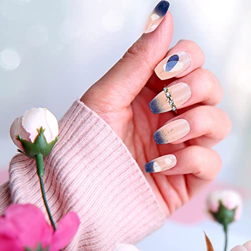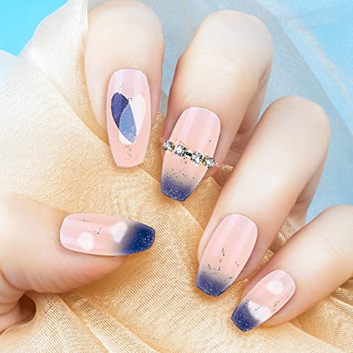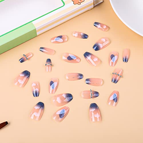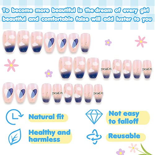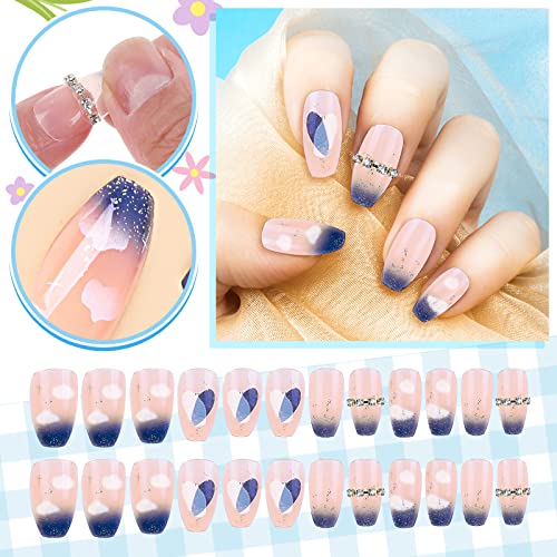 Cobee 3D Strass Stampa sulle Unghie Medie, 24 Pezzi Unghie Finte Quadrate Bara Unghie Finte con Copertura Completa di Diamanti Attaccare sulle Unghie Unghie Acriliche Bling (Cielo stellato blu)