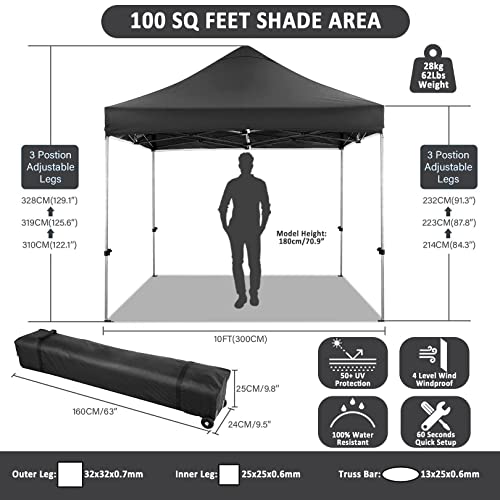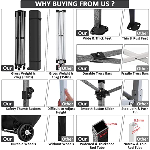 【3 Impostazioni di Altezza】La tenda a gamba dritta per feste 3x3 m ha 3 impostazioni di altezza. Il sistema di chiusura del pollice è facile da bloccare e rilasciare. Opzioni di altezza gamba dritta: 214 cm/84,3 pollici, 223 cm/87,8 pollici, 232 cm/91,3 pollici. Opzioni di altezza centrale della tenda corrispondente: 310 cm/122,0 pollici, 319 cm/125,6 pollici, 328 cm/129,1 pollici. Perfetto per attività commerciali, campeggio, festival, tailgating, eventi in giardino e così via.