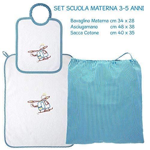 Coccole- set asilo"elicottero turchese" - 3 pezzi: 1 bavaglino, 1 asciugamano e 1 sacca - turchese - 3 mesi - 5 anni Scuola materna