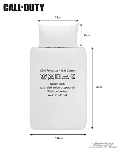 Specifiche del prodotto: questo è un prodotto Call of Duty con licenza ufficiale. Il piumino è disponibile come set standard per letto singolo o matrimoniale. Il copripiumino singolo misura circa 137 cm x 198 cm, il copripiumino matrimoniale misura circa 198 cm x 198 cm e le federe sono circa 75 cm x 50 cm, richiedono un cuscino di dimensioni standard. Composizione: 52% poliestere, 48% cotone.