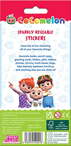 CoComelon - Confezione di adesivi riutilizzabili scintillanti. Divertiti ad attaccare tutte le tue cose preferite! Riutilizzabile su superfici non porose