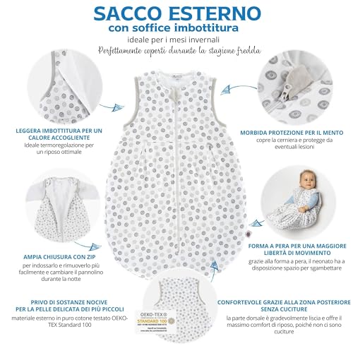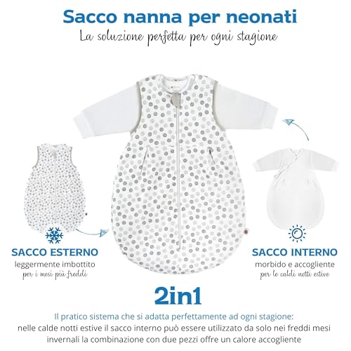 SEMPRE: Il sacco nanna neonata 2 in 1 è composto di un sacco nanna leggero con maniche interno e di un sacco nanna autunno all'esterno. Al completo, è un sacco nanna invernale. Il sacco nanna estivo a maniche è utile col caldo. Il sacco nanna mezza stagione esterno, è utile con il clima mite
