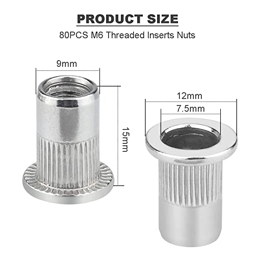 ➤【Contenuto della Confezione】 - La confezione contiene un totale di 80 dadi filettati in acciaio inossidabile m6, una quantità sufficiente per soddisfare le tue esigenze quotidiane. La lunghezza totale è di 15 mm/0,59 pollici, il diametro è di 9 mm/0,35 pollici, il diametro esterno superiore è di 12 mm/0,47 pollici, il diametro interno è di 7 mm/0,28 pollici, modello