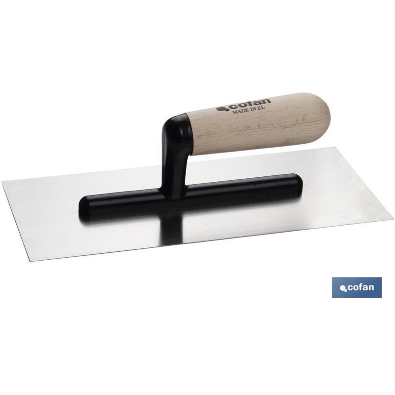 Frattazzo per microcemento | Realizzato in acciaio inossidabile | Misure: 280 x 120 x 0,4 mm | Manico in legno Cazzuola realizzata in acciaio inossidabile di ottima qualità di forma rettangolare, previene la ruggine e offre durata e re