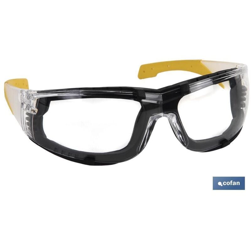 Occhiali di sicurezza imbottiti. Sono progettati per proteggere dagli impatti di particelle ad alta velocità e a bassa energia e dalle temperature estreme. Realizzato in policarbonato, TPR e gomma EVA. Aste gialle, molto comode e sicure. DPI CAT.II sec