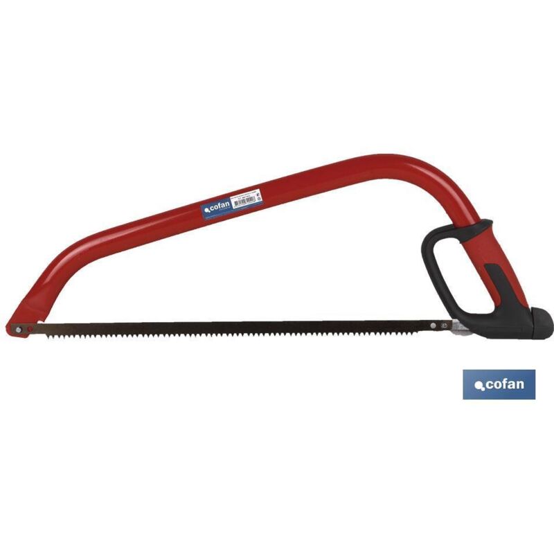 Seghetto per legno | Modello comfort | Misura 21/533 mm Seghetto ad arco modello comfort per legno. La sua misura è 21/533 mm. Ha una protezione e un tendicinghia in metallo e ABS. Include 1 lama da sega per legno secco già incorporata