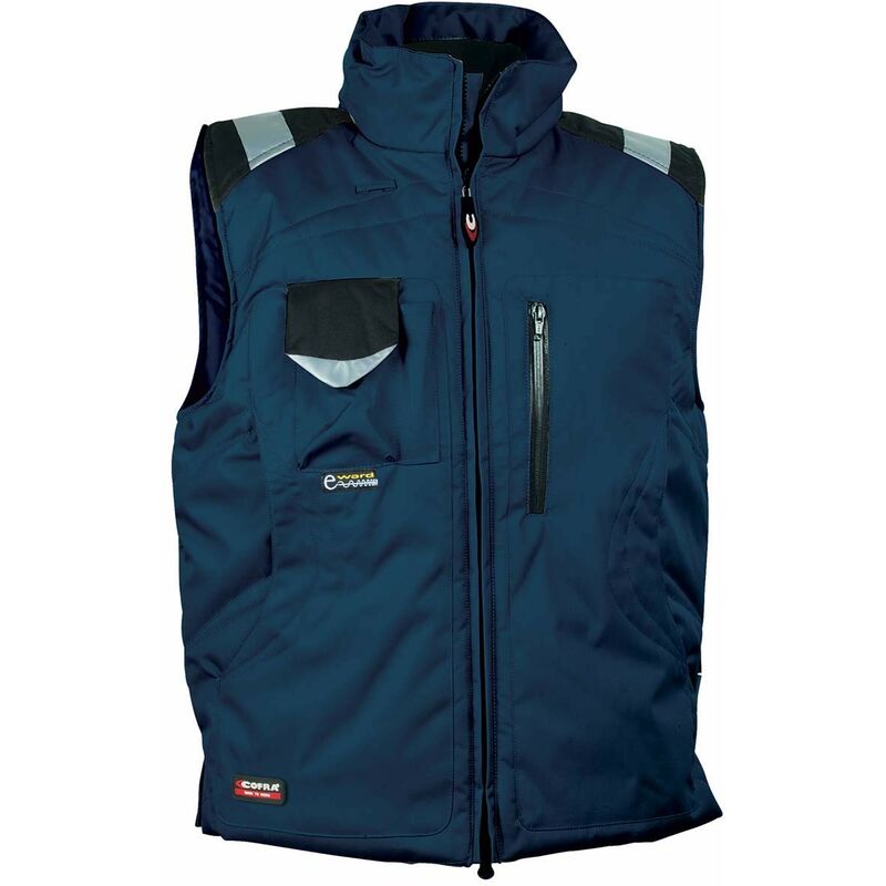 GILET IMBOTTITO POLAR NAVY COFRA gilet dotato di ampie tasche anteriori cappuccio regolabile a scomparsa gilet dotato di ampie tasche anteriori, cappuccio regolabile a scomparsa, fodera interna con spalla in pile, fondo posteriore più lungo, inserti rifrangenti 3M™ SCOTCHLITE™ Reflective Material - 8910 Silver Fabric, passante auricolare, spacchetti laterali, tasca interna con zip, tasca petto con zip spalmata, tasca porta cellulare con E-WARD, tasche scaldamano foderate in pile, tascone posteriore, zip interna fondo, zip YKK® - tessuto 100% poliestere spalmato poliuretano, fodera 100% poliestere, imbottitura 100% poliestere - area d'uso: aeroporti, agricoltura, edilizia, industria, logistica - contro il freddo, non rilevabile dai metal detector - profili riflettenti - tasca porta cellulare con tessuto E-WARD - 200 g/m²