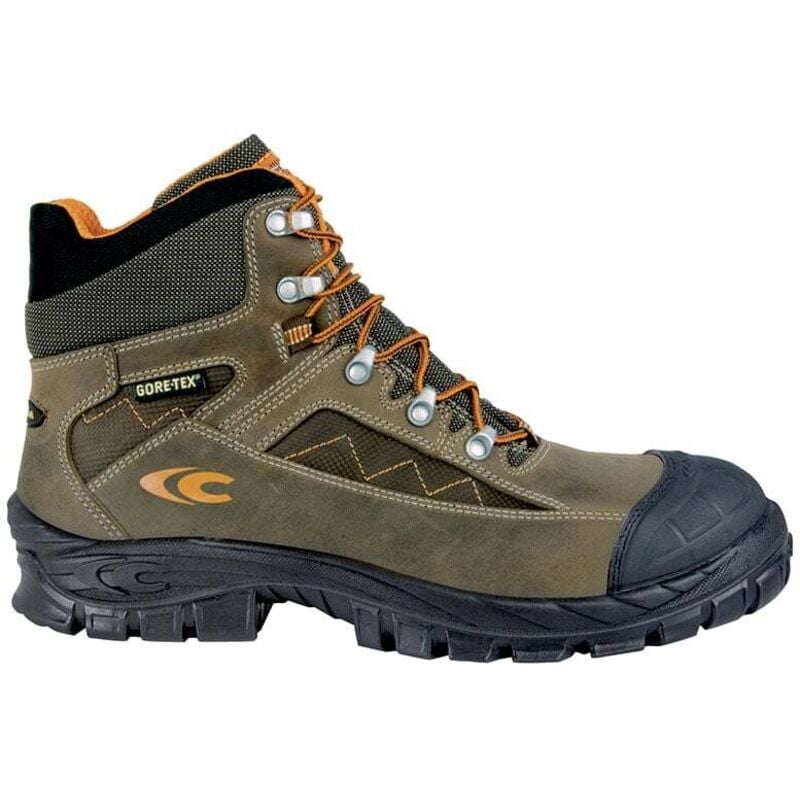 Scarpe Cofra con livello di Sicurezza S3 - Serie ASGARD / WATERPROOF, modello FROSTI Scarpa alta della linea Cofra ASGARD, ma appartenente anche alla linea WATERPROOF, è resistente alle infiltrazioni d'acqua grazie alla tomaia in nubuck Pull-Up idrorepellente e alla fodera in GORE-TEX: una membrana dotata di un miliardo e quattrocento milioni di micropori per centimetro quadrato che assicurano impermeabilità ed elevata traspirabilità alla calzatura, offre anche protezione contro batteri, agenti chimici ed elementi nocivi in genere resistendo anche alle alte temperature. Soletta TOP COMFORT in soffice poliuretano profumato rivestito da tessuto, con design anatomico ed un ottimo assorbimento degli shock;