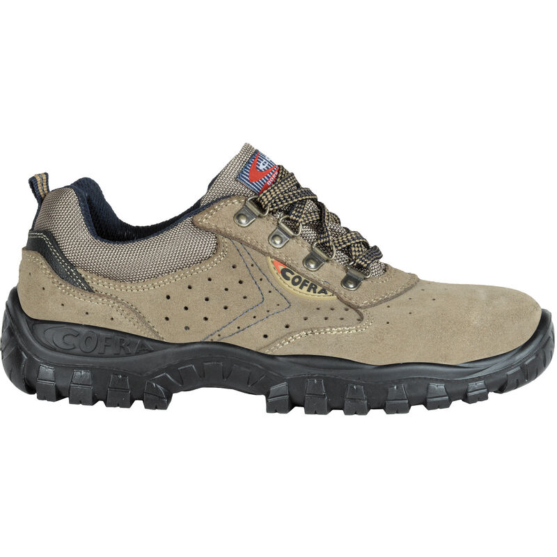 Mod. COSMOS S1P SRC tipo basso, soletta antiforo in nitrile, tomaia in pelle scamosciata forata, fodera in tessuto poliammide, puntale in acciaio, suola in poliuretano bidensità . A norma EN ISO 20345-2011 SRC: Resistenza allo scivolamento Numero 40