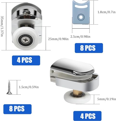 Ampia gamma di applicazioni: pezzi di ricambio per cabine doccia scorrevoli, ruote di ricambio per porta della cabina doccia, adatti per la maggior parte dei bagni doccia, bagni doccia e bagni a vapore, e sono installati sulla parte superiore e inferiore della porta della doccia per aprirlo e chiuderlo facilmente.